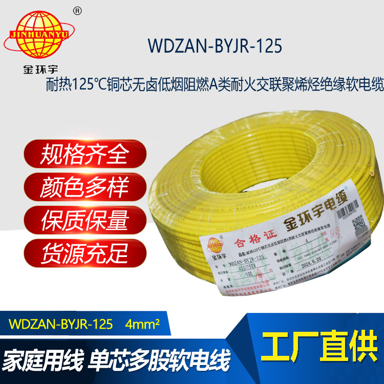 金環(huán)宇電線電纜 低煙無鹵A級阻燃耐火電線 4平方銅芯電線WDZAN-BYJR-125