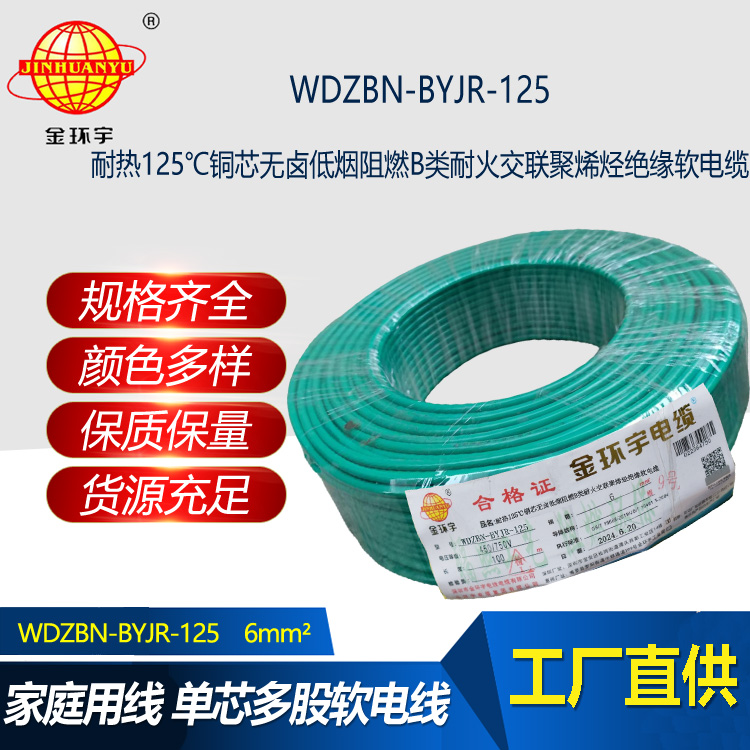 金環(huán)宇電線電纜 WDZBN-BYJR-125耐熱低煙無(wú)鹵阻燃耐火電線 6平方家用電線