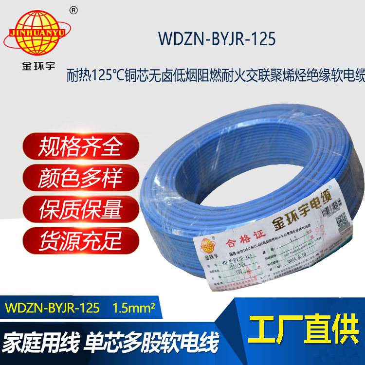 金環(huán)宇電線電纜 1.5平方電線100米WDZN-BYJR-125低煙無鹵阻燃耐火家裝用線