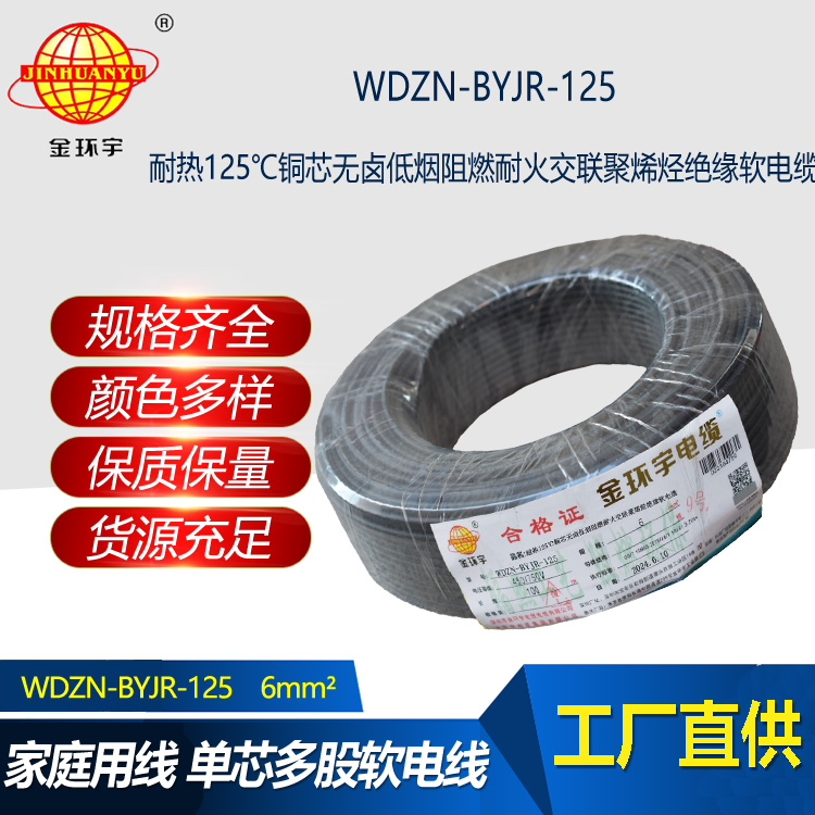 金環(huán)宇電線電纜 WDZN-BYJR-125銅芯電線耐熱低煙無鹵耐火阻燃6平方bvr電線